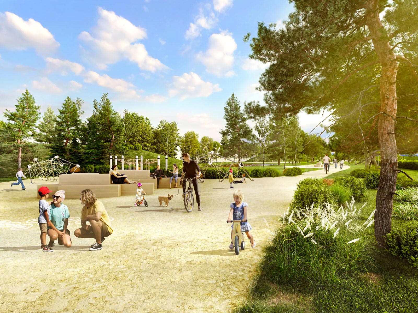 Přilehlý park o velikosti Žižkových sadů se stane místem pro setkávání rodin, oddych a sport. Jen kousek od centra Hradce Králové vznikne odpočinková zóna, která v této lokalitě doposud scházela. Velkorysý městský park, jehož zeleň byla projektována s vazbou na okolní krajinu, nabídne nejenom příjemné posezení a vodní plochy v podobě jezírek, ale i sportovní a herní prvky, jejichž výběr může svým hlasováním ovlivnit veřejnost.